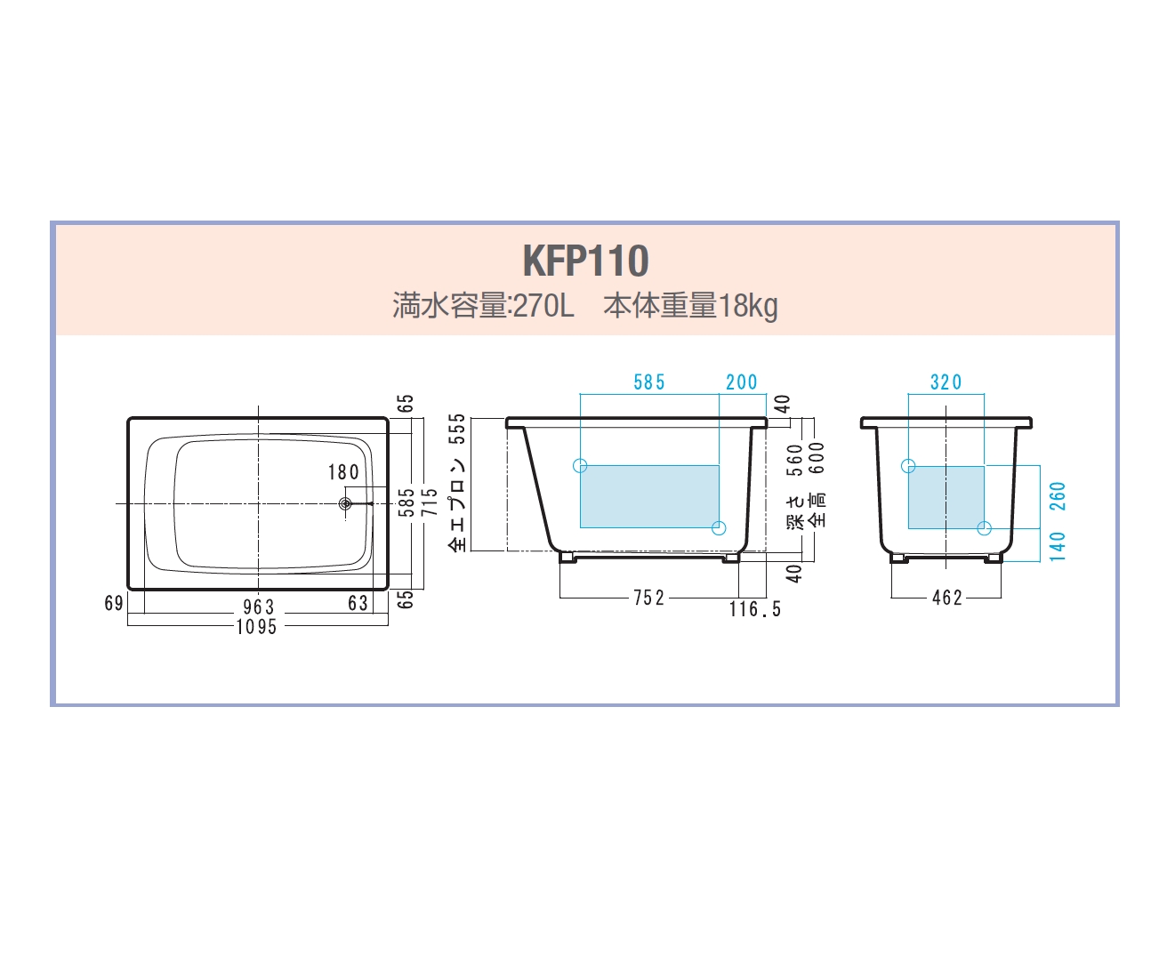 KFP110 FRP浴槽 1095×715×600mm ホワイト 1方全エプロン着脱式(左右変更可能)【JFE】