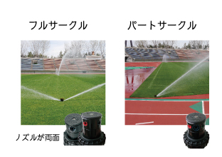 ![]() | ・用途で使い分けます※画像をクリックすると拡大します。全円で一方向に回転し続け、バックノズルで後ろ側にも水を飛ばすフルサークルタイプと可変角で折り返しの散水を行うパートサークルの2種類があります。どちらにも3つのノズルで近・中・長距離向けのに適正な数量を散布します。 | |||||