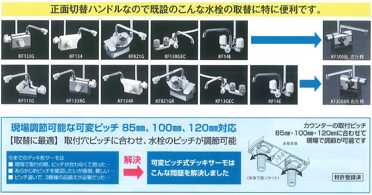 KF3008(L,R)【KVK】可変ピッチ 85・100・120mm対応 デッキ形サーモスタット式シャワー [KF3008]