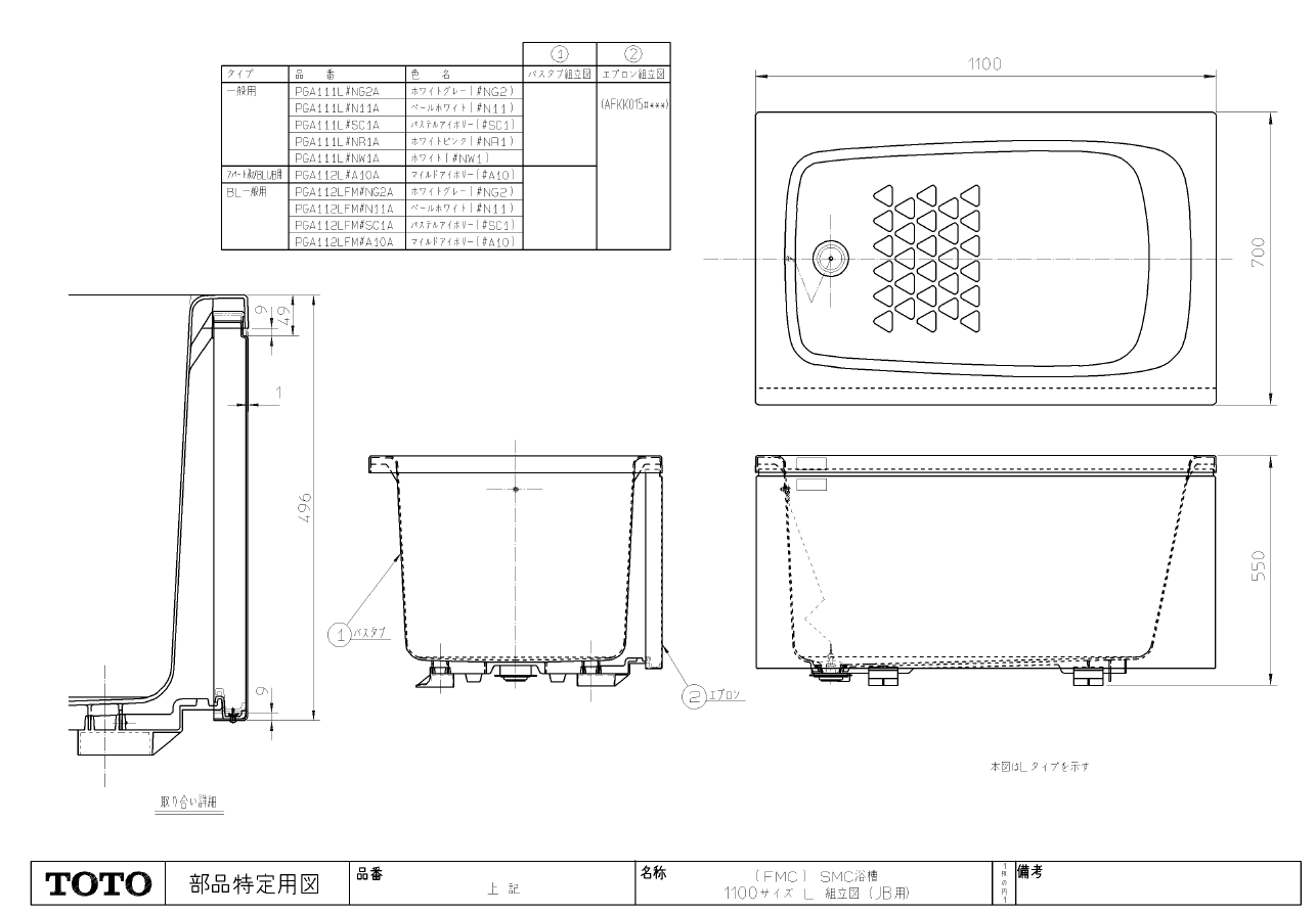 PGA111L PGA111R #NW1A【TOTO】1100プレスバス 浴槽