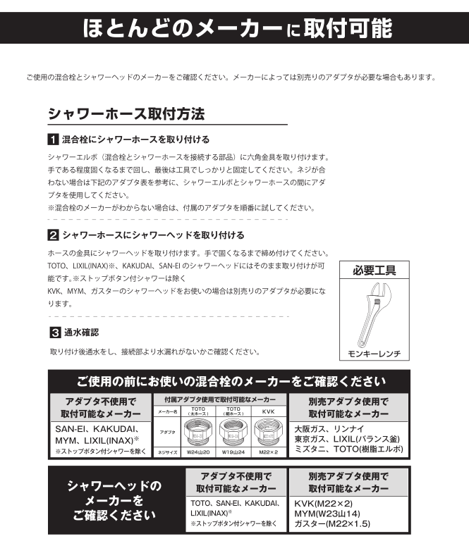 適合商品品番 | ▶直接取付可能 混合栓メーカー:SAN-EI,KAKUDAI,MYM,LIXIL(INAX) ▶直接取付可能 シャワーヘッドメーカー:TOTO,SAN-EI,KAKUDAI,LIXIL(INAX) ▶同梱アダプタ使用で取付可能 混合栓メーカー:TOTO(太ホース),TOTO(細ホース),KVK ▶同梱アダプタ使用で取付可能 シャワーヘッドメーカー:KVK,MYM,ガスター |