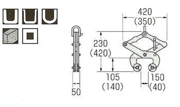 用途 | 同メーカーが吊り具を開発以来、長い間利用いただいているスタンダードな吊り具です。 吊り上げ可能な二次製品 U字溝、ベンチフリーム、U字フリューム、コンクリート棚板、コンクリート桝 など。 定格容量: 500kg (2台使用時) つかみ幅: 40〜150mm |