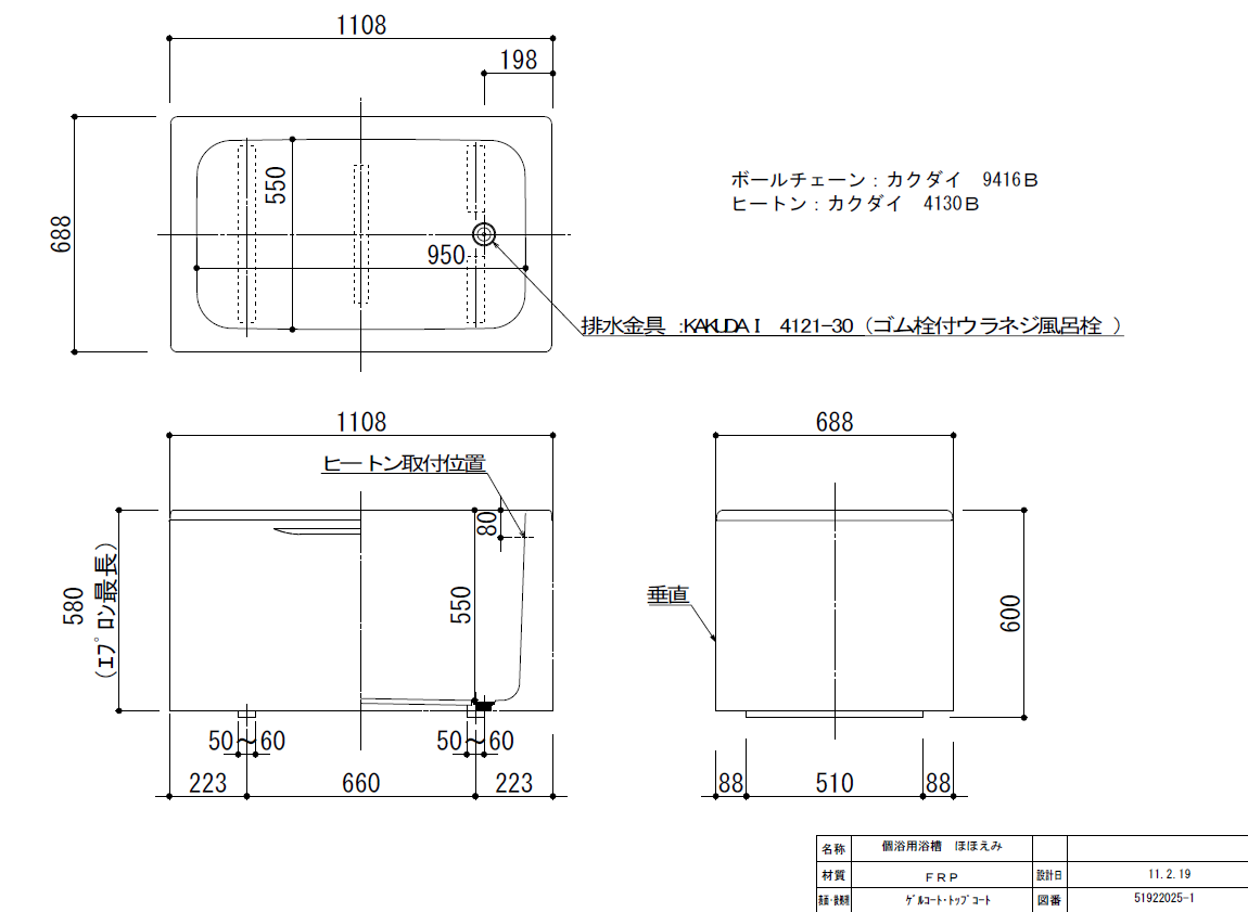 FRP カラーバスタブ スマイルL 1108×688×H600 深型 幅:1100 ENILNOエニルノ