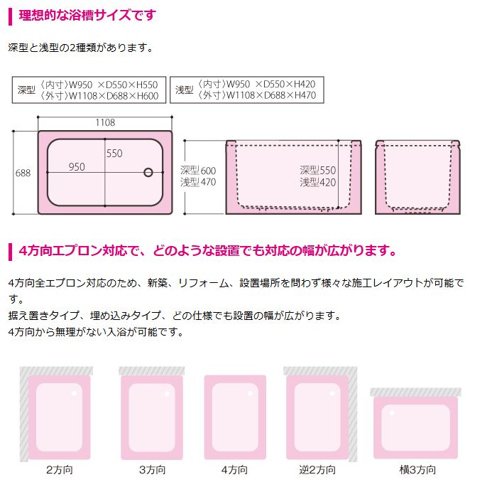 特徴 | ●4方向全エプロン対応のため、新築、リフォーム、設置場所を問わず様々な施工レイアウトが可能です。 据え置きタイプ、埋め込みタイプ、どの仕様でも設置の幅が広がります。 4方向から無理がない入浴が可能です。 ●設置・施工場所に合わせて豊富なカラーバリエーション。特注色もご対応しております。ご相談下さい。 |