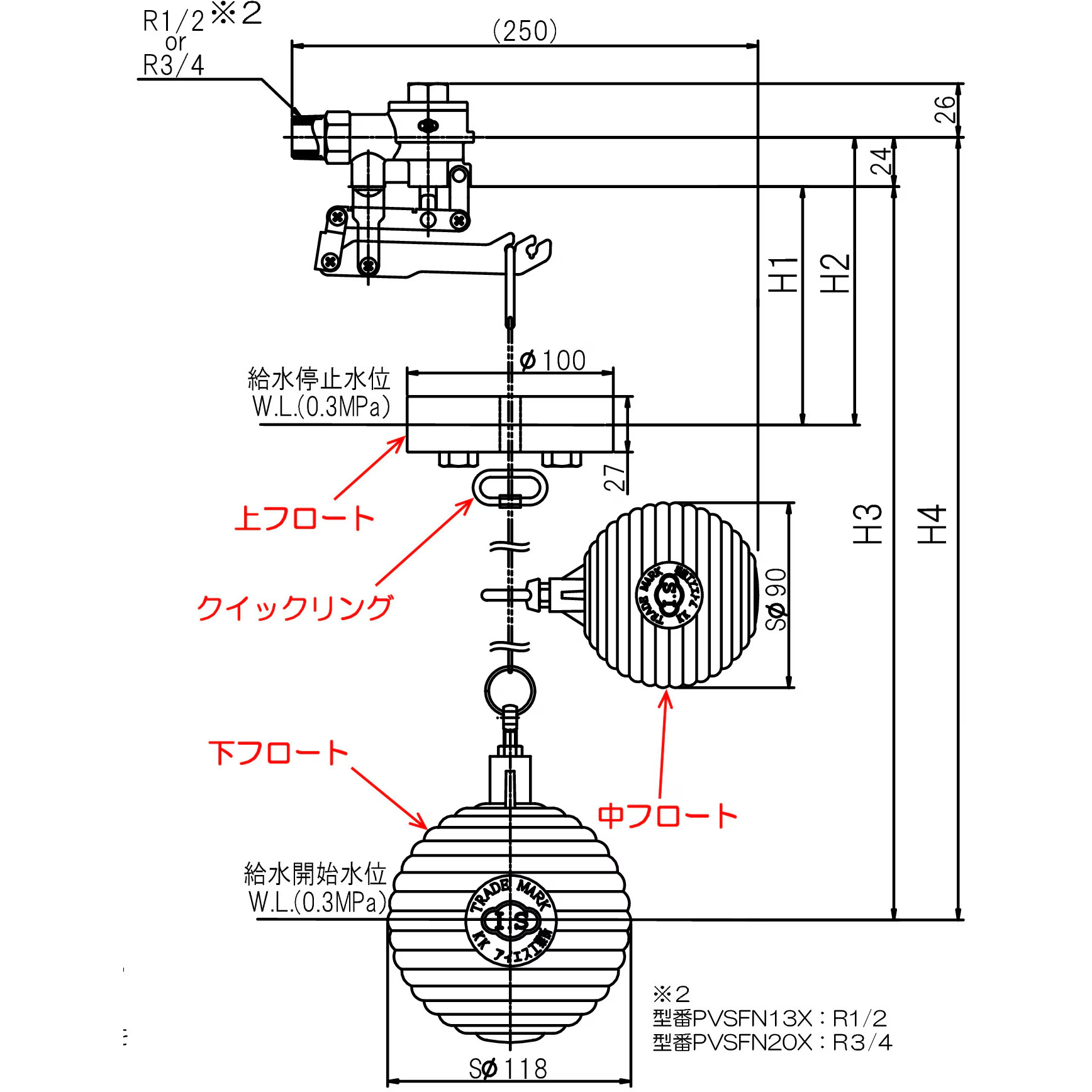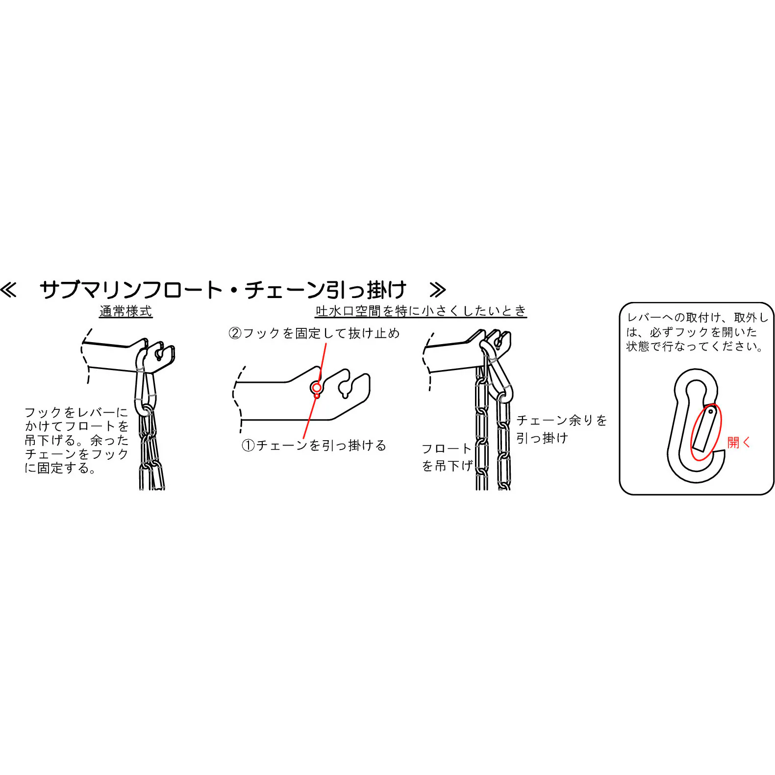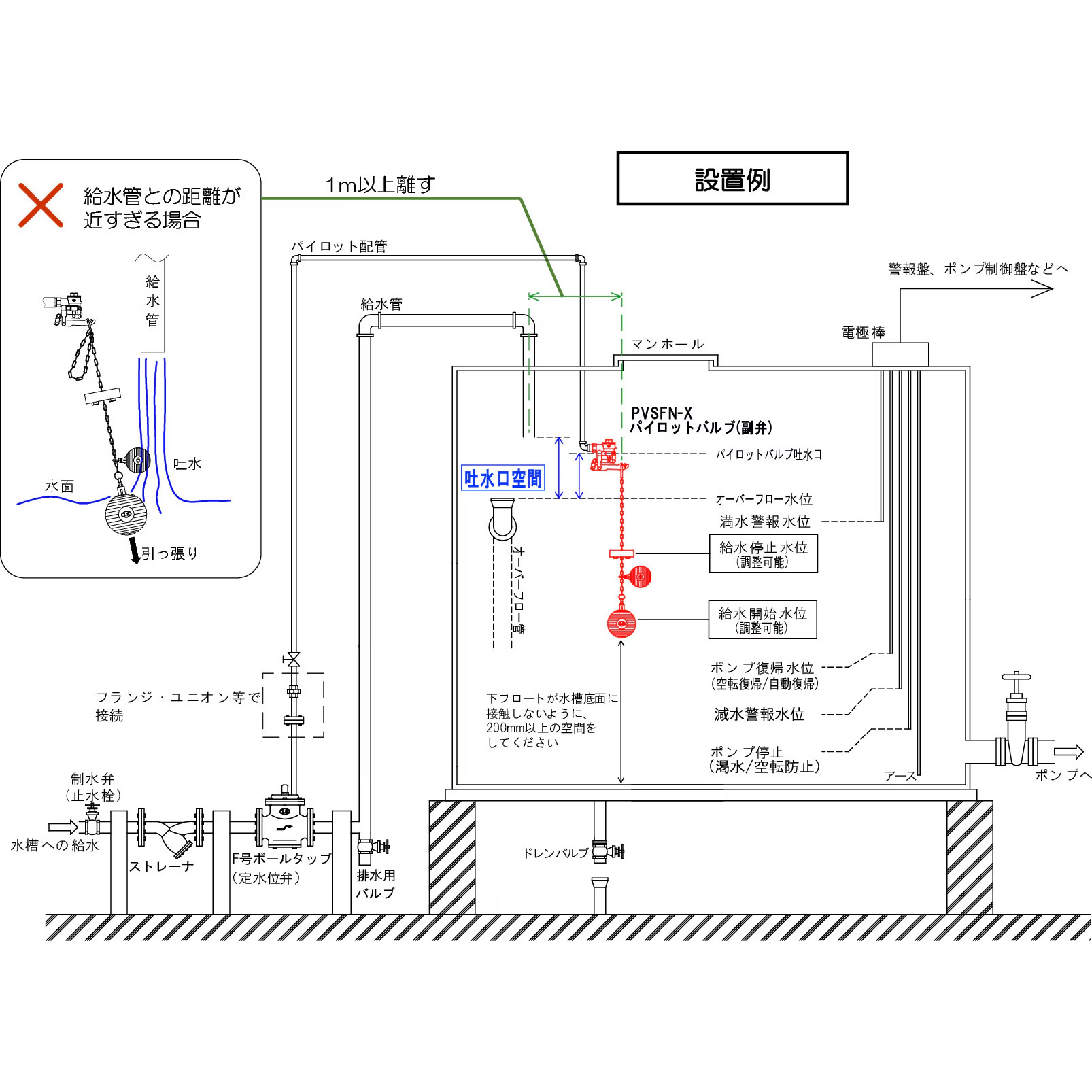 注意事項 | ※本商品は、パイロットバルブ(副弁)のみです。 ※定水位弁本体・パイロットバルブは、必ずメーカー製品の組み合わせで使用してください。 ※他社製の定水位弁本体・パイロットバルブとメーカー製品とを組み合わせて使用した場合、作動を保証いたしかねます。 ※記載の給水停止水位と給水開始水位の調整範囲の数値は静水圧:0.3MPa時の目安です。(公差±15) ※水圧・水量の使用条件によって給水開始・停止水位が変動します。 ※上フロートと下フロートの設定位置で、出水・止水の水位差を設定する場合には、給水圧力が0.1MPa以上必要です。 ※電極棒等により設定されている満水警報水位、減水警報水位、ポンプ停止・復帰水位との ※上下関係を適切に設定し、定水位弁・パイロットバルブ等の異常を検出できるようにしてください。 ※パイロットバルブの取付は、メンテナンスに支障の無いよう、マンホールに近い位置としてください。 ※サブマリンフロートの位置は、給水管の吐水口より1m以上離してください。 ※給水の勢いにサブマリンフロートが巻き込まれると、正常に動作しないことがあります。 ※関係法令等をご確認の上で、適切な吐水口空間を確保してください。 |
