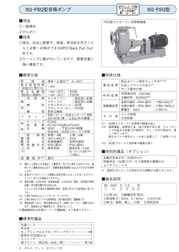 荏原ポンプ65SQE5.75B(三相200V 0.75kw 50Hz)SQ型自吸ポンプ 65mmエバラ