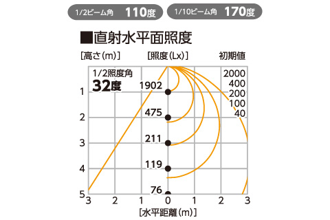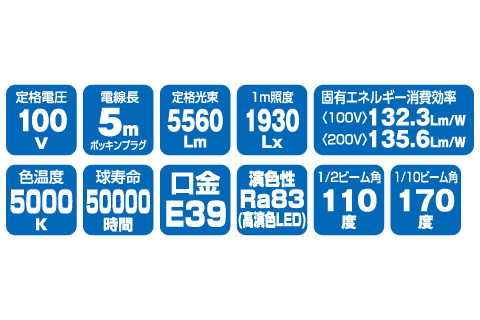 | 仕様 | ▶周波数 50/60Hz ▶定格電流 (100V)0.44A/(200V)0.21A ▶消費電力 (100V)42W/(200V)41W ▶色温度 5000K ▶入力電圧範囲 90〜240V ▶使用環境温度 -20℃〜45℃ ▶球寿命 50000時間 |