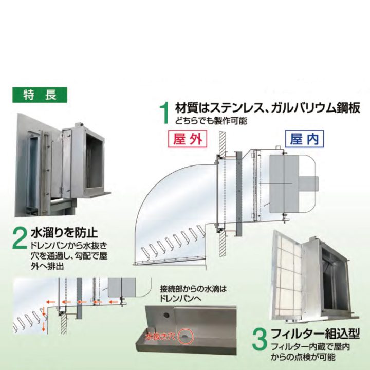| 特徴 | ●ゲリラ豪雨でも雨水の侵入を防止、 屋内設備へのリスクを軽減 ●95%雨水浸入をカット(従来品比) ●オールステンレス製で丈夫 ●本体内部の防雨板で雨水をキャッチ、 内部の樋(とい)で外部に排水し、屋内への雨水の侵入を阻みます。 ●豪雨でも対応できることを社内実験により確認済みです。 ●取付枠も製作いたします。 ●塗装も可能です。 |