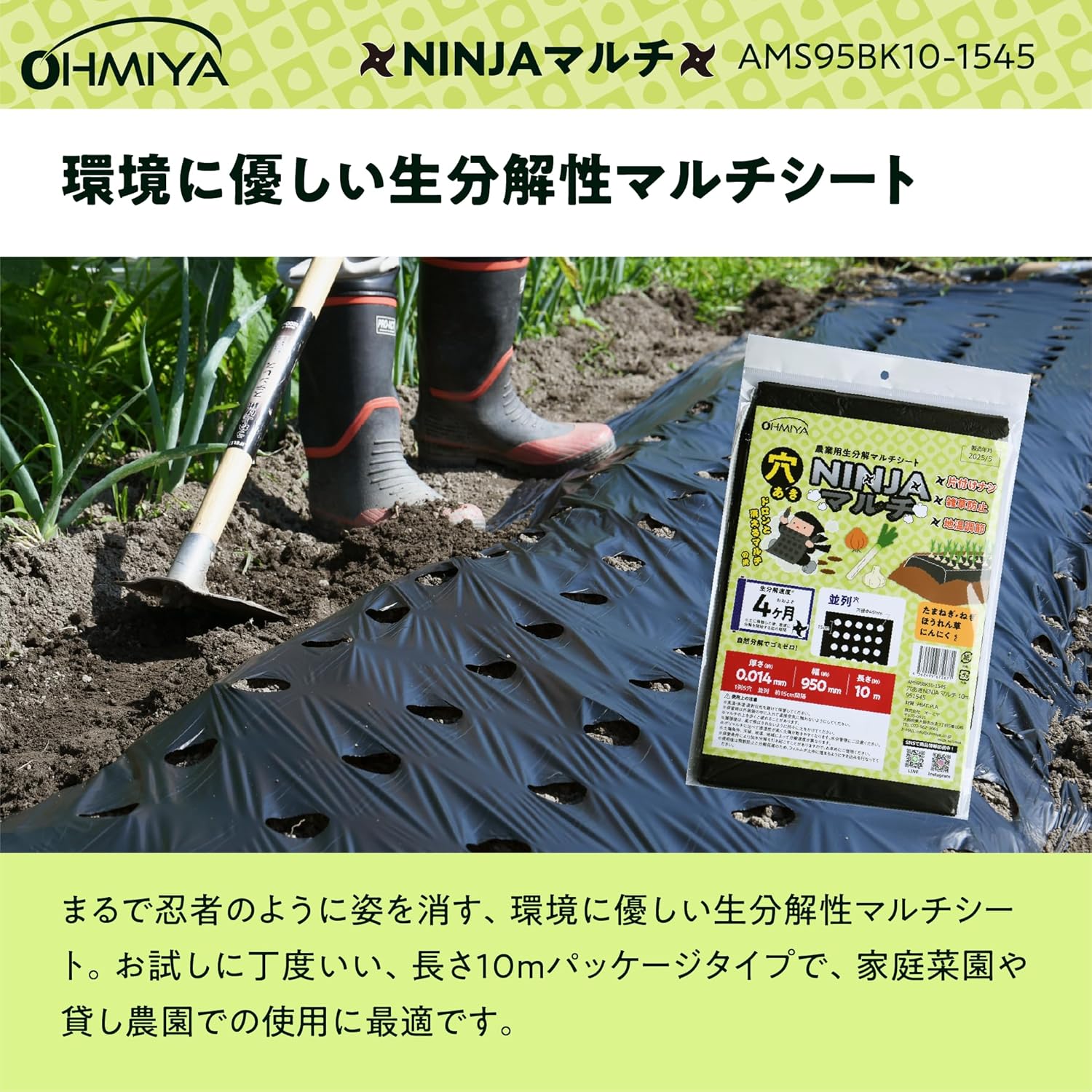 | 特徴 | 家庭菜園・多条植えに!生分解マルチ「NINJAマルチ(9515-45モデル)」の特徴 1. 穴あき仕様と適用作物(多条植え向け) 穴の仕様(9515-45): 5列平行に45mm穴が開いています。 穴が前後左右に15cmピッチで配置されており、多条植えに特化しています。 適用作物: 一定間隔で複数列植えたい玉ねぎ、にんにく、らっきょう、にら、わけぎ、春菊、ほうれん草などの栽培にぴったりです。 穴の特徴: 作物を多く植えられる、Φ45mm穴の5列平行タイプです。 2. 家庭菜園・お試しに嬉しいサイズ 使い切りサイズ: 長さ10mの使い切りタイプ。生分解性マルチシートを試したい方、家庭菜園をされる方に最適です。 初心者も安心: 厚み0.014mmの薄手にもかかわらず引張強度が強いため、マルチシート初心者でも安心して展張(マルチ張り)が可能です。 3. 廃棄・回収の手間が不要な環境配慮 回収・処分不要: 収穫後のマルチシート回収作業や廃棄処分手数料が不要です。 まるで忍者のように姿を消す(生分解される)ため、後片付けの負担がありません。 生分解性: 使用後に土にすき込むだけで、土壌中の微生物により水と炭酸ガスに分解され、自然に還ります。 人にも自然にも優しい商品です。 4. 基本機能と分解速度 従来機能: 従来のポリマルチシートと同様に、作物生育期の雑草対策、地温調節、肥料流出防止に役立ちます。 分解開始期間※1: 約4ヶ月。 (※1 土に接触した後、急速に分解を開始するまでの期間。) 最終分解期間※2: 収穫後に土にすき込み、微生物により完全分解されるまでに1〜3年かかります。(畑の条件により変化します。) |