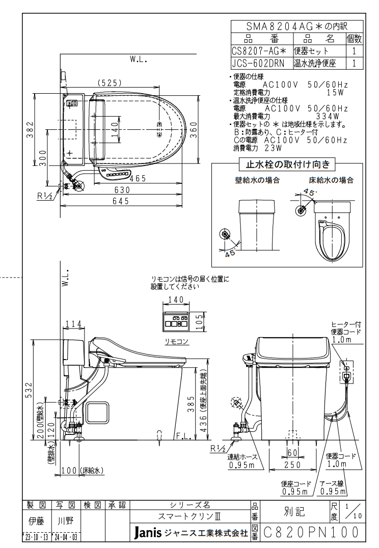 SMA8204AGB 温水洗浄便座付き タンクレストイレ スマートクリン3【JANIS ジャニス】後抜120mm 壁