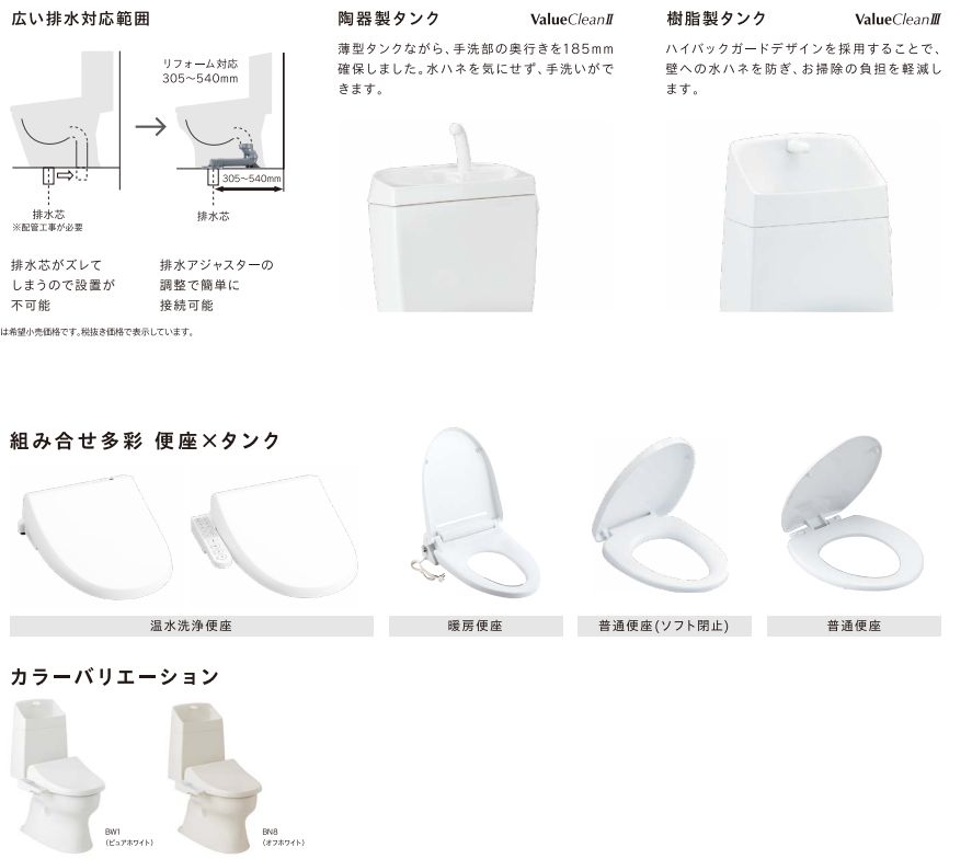 | 特徴 | ▶標準床排水対応: 排水芯 200mm の一般的な設置場所に対応します。 ▶陶器製タンク採用: 傷つきにくく、清掃性に優れた陶器製の給水タンクです。 ▶お掃除簡単設計: 便器はフチなし形状で、日々のお手入れが簡単です。 ▶一般地仕様: 寒冷地以外の地域で広く使用できる仕様です。 |