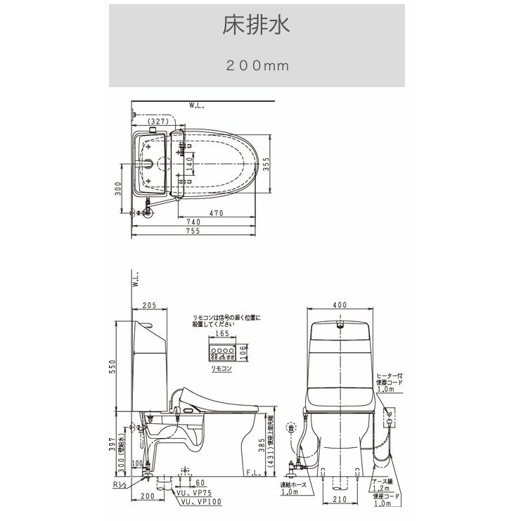標準床排水対応: 排水芯 200mm の一般的な設置場所に対応します。