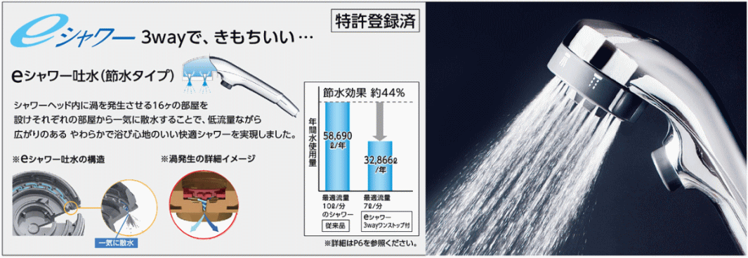| 特徴 | ▶eシャワーNf (New full-flow): 浴び心地と節水を両立させたシャワーです。 ▶ワンストップ機能: シャワーヘッド本体に付いているボタンで、一時的に吐水・止水を切り替えられる手元止水機能です。 |