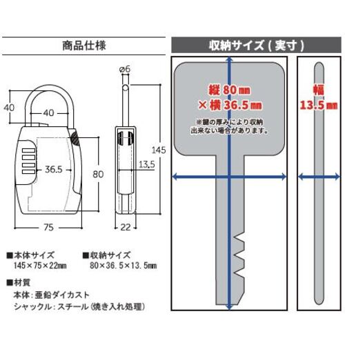 | 仕様 | ●ダイヤル可変式 ●幅(mm):75 ●奥行(mm):22 ●高さ(mm):145 ●ダイヤル:4 ●ツル径(mm):6 ●収納内寸 幅×奥行×高さ(mm):13.5x36.5x80 ●材質 ●本体:亜鉛ダイカスト |